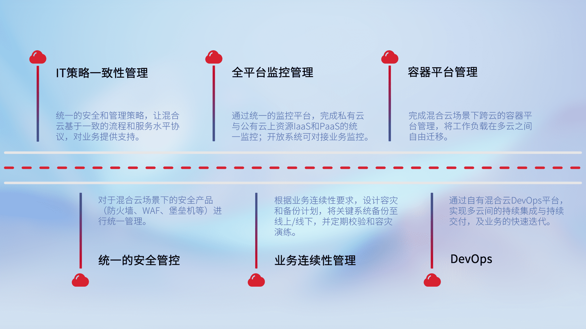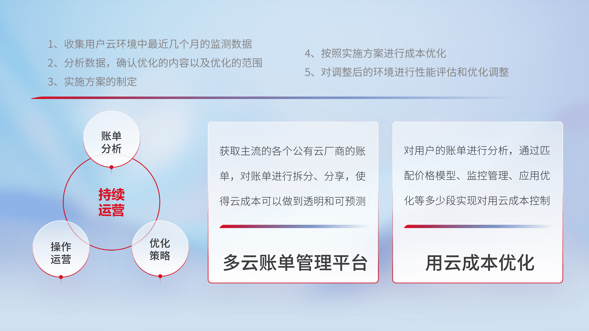 通过多云纳管,,,以统一的资源数据模型把客户的云资源进行抽象和封装,,,进而实现对多云资源的统一操作,,,保障云资源管理的可靠性、、、、稳定性与可用性。。。量身定制化运维内容,,,,配置、、开发运维、、、补丁管理、、、备份、、、、监控、、、、认证和访问管理、、审计和日常巡检等,,,,保障在用云过程中的可靠度,,,,稳定度以及高可用率。。。